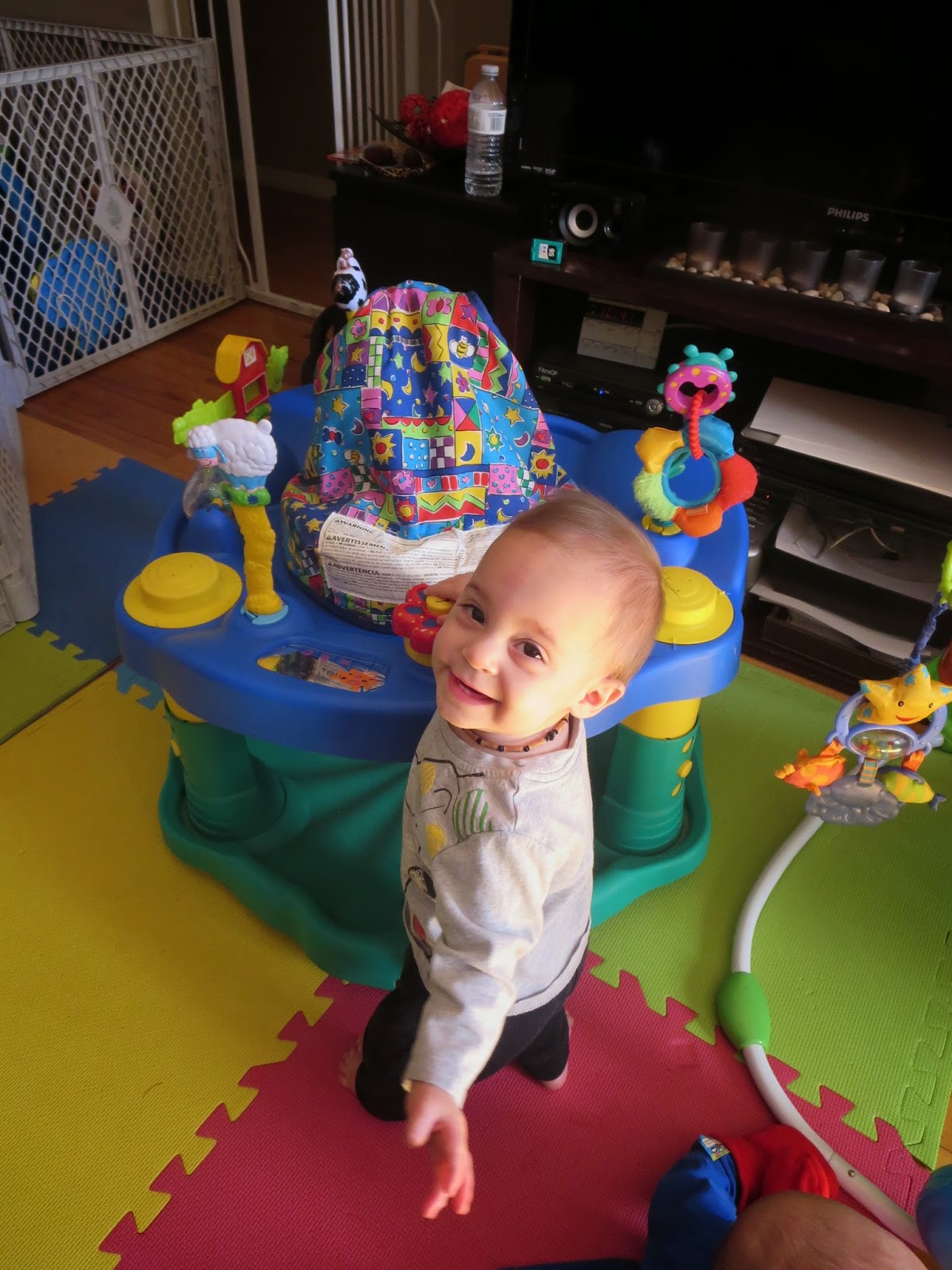 Jacob has started to clearly say Maman! So that's adorable!! He's also trying to imitate us when we say yay! while clapping our hands to encourage the boys when they do something good. His version turns out more like AYEEEEE instead of yay! and his hand clapping is more like one clap then his hands stick together and he shakes them up and down.... haha... but he's trying and he's freaking adorable. He's lucky he's cute because the little buddy spent yet another night in our bed on Wednesday... same story as last time... woke up in a panic, wouldn't settle. Once he finally fell asleep on me, he'd wake up and scream the moment I tried to put him back to bed so back in our bed he came... I got more sleep this time than last but the little 15lbs sack of bones takes more room than my husband does! At least I can tell Gabe to get off me... Jacob... not so much! I put him back in his crib at 5AM so I could grab a few hours of sleep and he cried for a bit but finally settled... man oh man! I hope this isn't a weekly thing!